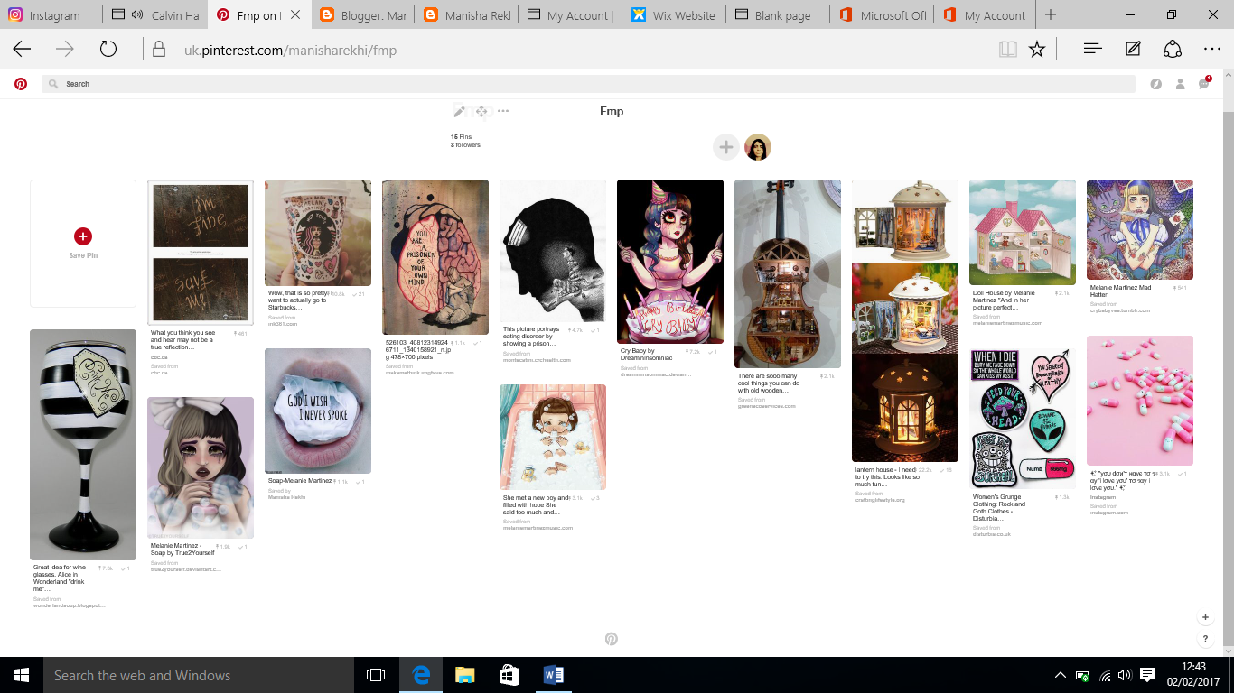 today I had my work in progress and discussed on ideas for the final major project. at the moment I created a Pinterest board based fan art of Melanie Martinez and images that are associated with depression.
